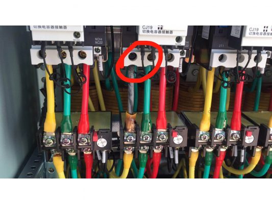 故障情況:三相電機(jī)缺相,損壞電容接觸器未按要求壓接銅鼻子