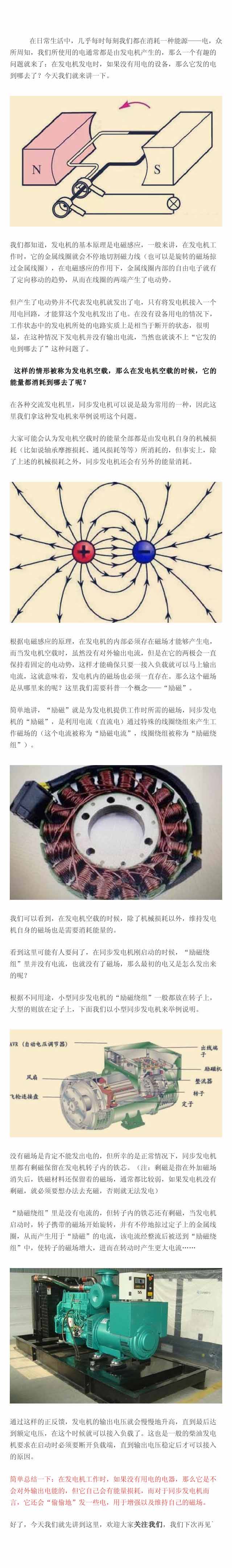 【在發(fā)電機(jī)發(fā)電時(shí),如果沒有用電的設(shè)備,那么它發(fā)的電到哪去了?】在日常生活中,幾乎每時(shí)每刻我們都在消耗一種能源——電,眾所周知,我們所使用的電通常都是由發(fā)電機(jī)產(chǎn)生的,那么一個(gè)有趣的問題就來了:在發(fā)電機(jī)發(fā)電時(shí),如果沒有用電的設(shè)備,那么它發(fā)的電到哪去了?戳圖看