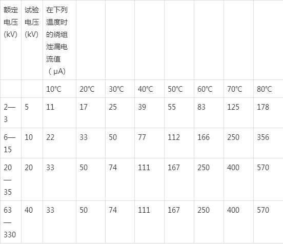 變壓器直流耐壓時泄漏電流與環(huán)境溫度對應的泄漏電流見表