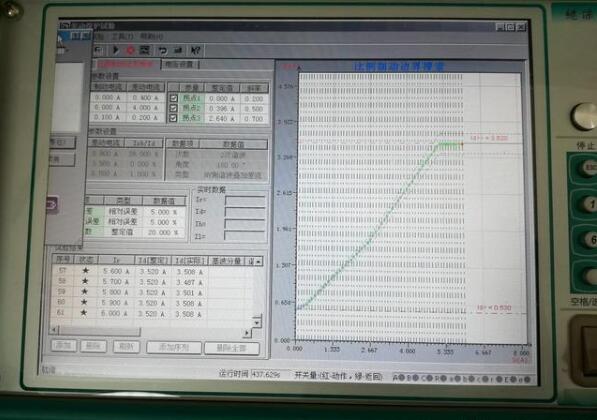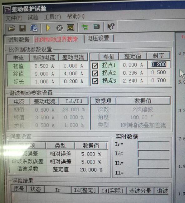 點(diǎn)擊“開始按鈕”按鈕,繼保測(cè)試儀便能自動(dòng)尋找出Icd0、Isd、Izd0、K等比率制動(dòng)特性數(shù)值,并描出比率制動(dòng)特性曲線圖。這個(gè)曲線若在繼電保護(hù)測(cè)試儀自動(dòng)生成標(biāo)準(zhǔn)的比率制動(dòng)曲線的誤差范圍內(nèi),則此次試驗(yàn)結(jié)果合格,若在誤差范圍外,則需重新調(diào)整掃描精度,重新測(cè)試,直到結(jié)果合格為止。