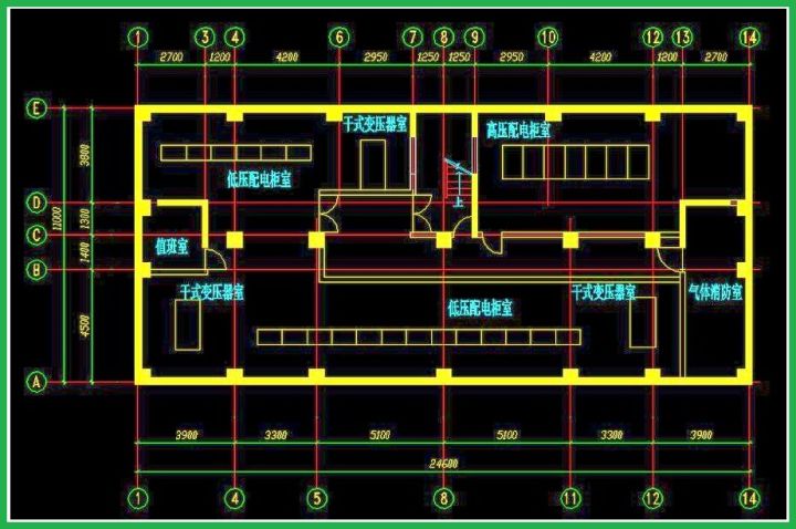 這是一個(gè)配電室平面圖,圖中黃色的是墻體和立柱。我們看到,干式變壓器和低壓開關(guān)柜共處一室,其實(shí)就是電力設(shè)備同處一室。這樣做好處是顯然的,相互之間的距離短了,電纜和母線橋架也短了,既節(jié)約了成本,有方便了維修和操作。