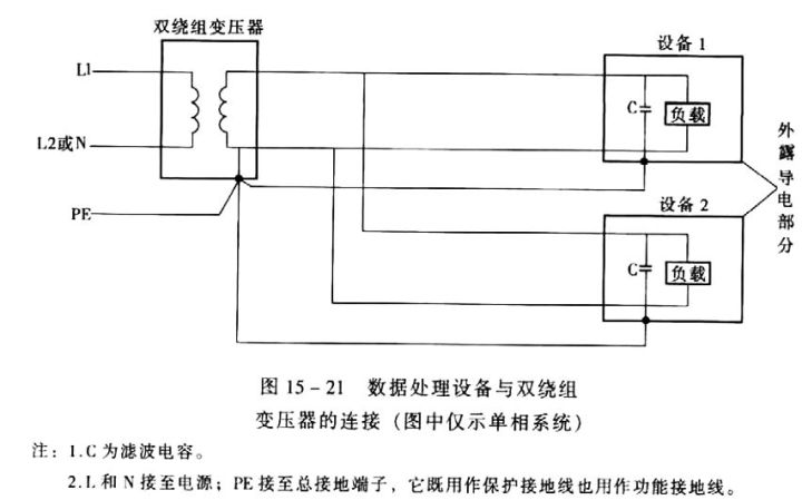 (3) 利用雙繞組變壓器限制電容泄漏電流的流經(jīng)范圍和路徑中斷的幾率,其連接如圖15- 21所示。雙繞組變壓器的二次回路宜采用TN系統(tǒng)。如有特殊需要時也可采用IT系統(tǒng)。