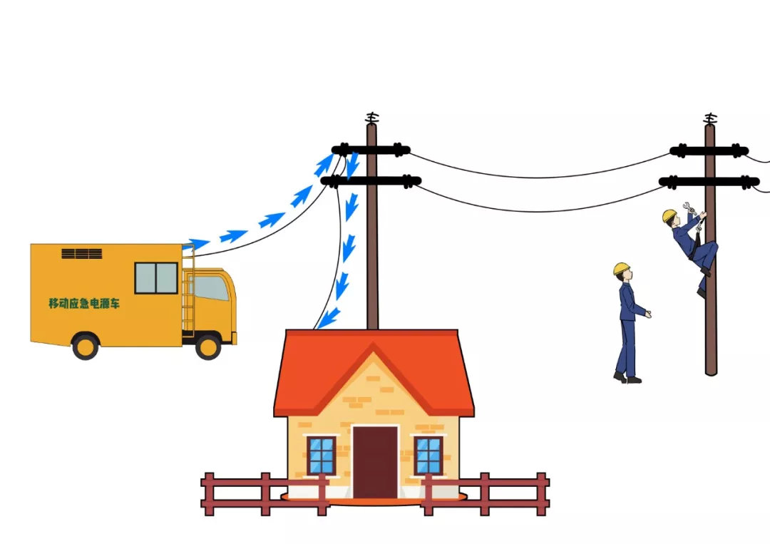 當小e家的電源A線路需要停電檢修,卻還沒有實現(xiàn)“手拉手”供電時,一輛移動電源車會開到附近,臨時充當“B線路”角色為小e的家供電。