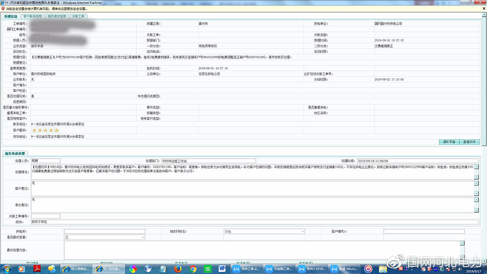 【電費交到他人帳戶 供電職工六次登門要回】 “真是謝謝你們幫我要回電費,我以后交費一定認真核實戶號和姓名是否一致,不能再把電費交到別人的帳戶上了!”9月18日,河北石家莊桃園鎮(zhèn)蔣家莊村民蔣女士接到供電職工朱倫和張輝波幫助拿回的100元電費后,激動地說。