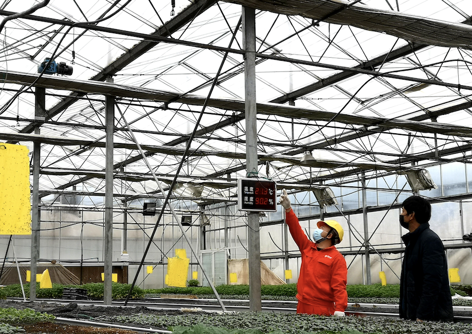 國網(wǎng)重慶電員工為育苗大棚電力線路進(jìn)行用電安全檢查。