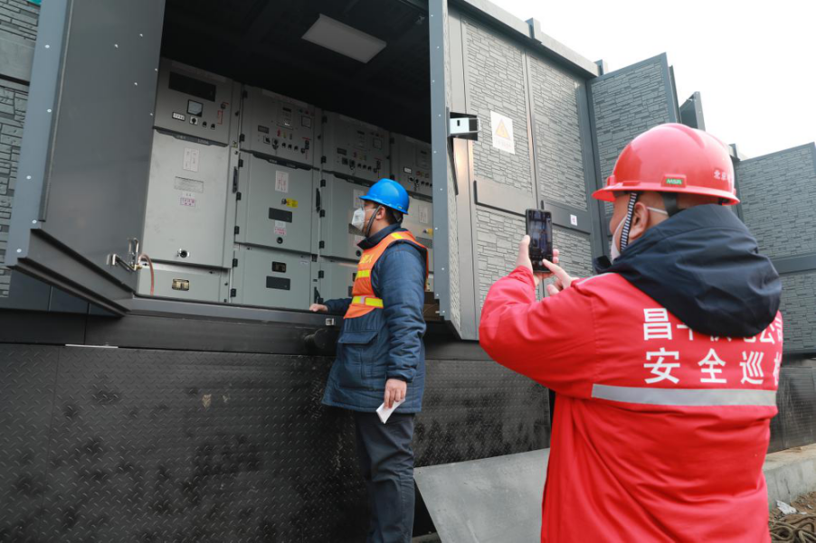 國(guó)網(wǎng)北京昌平供電公司安全巡檢人員對(duì)北京小湯山醫(yī)院箱變進(jìn)行巡視檢查。(閔政君)