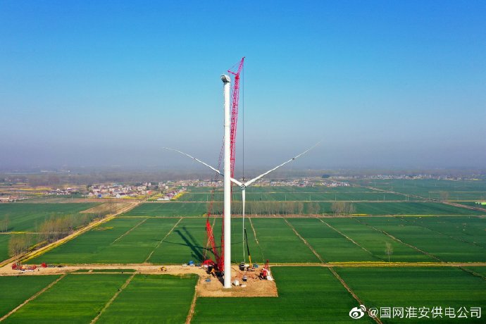 【加快風電項目配套建設】4月7日,施工人員在漣水縣六塘河公興河風電場安裝風力發(fā)電機組。連日來,淮安漣水縣供電公司組織人員積極對接六塘河公興河風電場項目,全力做好項目配套線路和變電站間隔建設,保證風電項目按期投產發(fā)電,有效改善當?shù)啬茉唇Y構