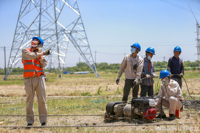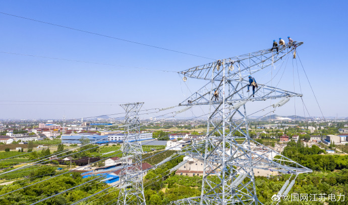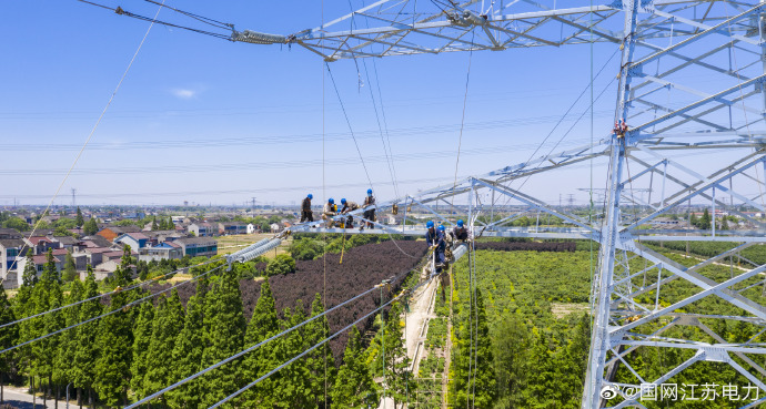 【高空舞者”架起送電“動脈”】5月12日,在江蘇常州中吳至湖濱220千伏線路工程現(xiàn)場,江蘇省送變電有限公司施工人員正在60米高空架設(shè)導(dǎo)線。作為500千伏中吳變電站送出工程,建成后將大力提高常州地區(qū)電網(wǎng)供電可靠性,為當?shù)亟?jīng)濟持續(xù)穩(wěn)定發(fā)展提供保障。