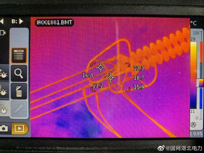 拍一張照,導(dǎo)線燒不燒全知道。6月18日,國(guó)網(wǎng)湖北檢修公司鄂西北運(yùn)維分部職工對(duì)500千伏斗樊二回線開展耐張接點(diǎn)紅外測(cè)溫工作。打開紅外測(cè)溫儀,輕輕一點(diǎn),導(dǎo)線溫度、接點(diǎn)溫度全記錄,及時(shí)發(fā)現(xiàn)發(fā)熱缺陷并處理,讓設(shè)備以最優(yōu)的狀態(tài)迎峰度夏。