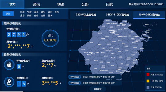 7月8日,國(guó)網(wǎng)浙江信通公司打造的數(shù)據(jù)產(chǎn)品“電力災(zāi)害數(shù)據(jù)指南針”已上線試運(yùn)行一周,有效助力浙江省政府及國(guó)網(wǎng)浙江電力防汛抗臺(tái)工作。該數(shù)據(jù)產(chǎn)品能從省、市、縣三級(jí)展現(xiàn)災(zāi)害區(qū)域內(nèi)客戶、企業(yè)、臺(tái)區(qū)及變電站的影響情況,直觀展現(xiàn)停電數(shù)、累計(jì)停電數(shù)、累計(jì)復(fù)電數(shù)、累計(jì)停電比例和累計(jì)復(fù)電比例等指標(biāo)的實(shí)時(shí)數(shù)據(jù)及趨勢(shì)變化情況,指標(biāo)數(shù)據(jù)每小時(shí)更新一次。災(zāi)害數(shù)據(jù)指南針?biāo)鶚?gòu)建的數(shù)據(jù)服務(wù)通過政企服務(wù)平臺(tái)及政務(wù)專線送至政務(wù)網(wǎng),幫助浙江省政府第一時(shí)間掌握受災(zāi)地區(qū)電力中斷及恢復(fù)情況,助力政府打造全方位的應(yīng)急防護(hù)指揮體系。