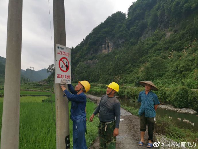 7月19日,國網(wǎng)鳳凰縣供電公司員工楊長青等人在竿子坪鎮(zhèn)洞腳村魚塘附近安裝“高壓危險,禁止釣魚”標示牌。(滕新春) ????