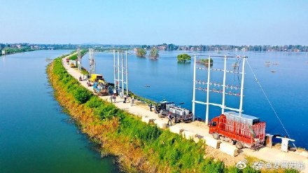 在廬江縣同大鎮(zhèn)白石天河古圩段圩堤上進(jìn)行立桿、架線、安裝配變?cè)O(shè)備