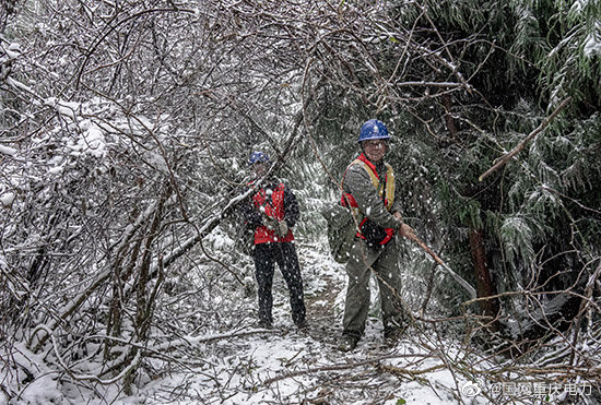 【海拔1800米 10年的風(fēng)雪“約定”】7日清晨,寒風(fēng)刺骨。簡(jiǎn)短的班前會(huì)后,國(guó)網(wǎng)重慶涪陵電力公司輸電運(yùn)檢一班黃勝一行4人整理好工具,踏上了巡線之路,這是他們前往武陵山區(qū)海拔1800多米的110千伏濤中線巡線的第10個(gè)年頭。110千伏濤中線連接涪陵白濤變電站和武隆中堡灣變電站,是貴州小水電上網(wǎng)的主干線之一。其中,20號(hào)桿至40號(hào)桿常常是降雪影響的地區(qū),33號(hào)桿海拔1860米,是海拔最高、受降雪影響最大的電線桿,也是巡線工人主要的巡察點(diǎn)?!澳銈冏呗c(diǎn)兒,我來把樹枝清理一下。”33號(hào)桿周圍溝壑縱橫、林深草密,道路兩邊的灌木、竹林等被壓彎壓垮,完全封死了前進(jìn)的道路,走不上去,只能靠爬,平日里只需40分鐘的路程在雨雪天氣下要耗時(shí)2個(gè)小時(shí),到達(dá)33號(hào)桿時(shí),巡線工人的鞋子與褲腳早已被雪水浸透。“冬季每遇凝凍,電力線路常常覆冰。12月開始到次年2月我們都要進(jìn)行防覆冰巡視,遇上惡劣天氣,每天都要上山巡檢,主要查看線路結(jié)冰情況、桿塔是否有裂紋、拉線是否松動(dòng)等,如果覆冰樹竹倒伏在線路上要及時(shí)組織清砍?!秉S勝說。對(duì)于這些線路和桿塔,每一位巡線員都傾注了很深的感情?!拔覀兿窈亲o(hù)孩子一樣呵護(hù)著它們,只要電網(wǎng)能安全穩(wěn)定運(yùn)行,我們就心安了?!?/p>
