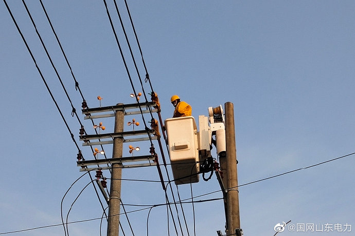 【帶電作業(yè) 保障寒冬供電穩(wěn)定】1月20日,國網(wǎng)利津縣供電公司帶電作業(yè)人員在10千伏前宋線42號桿帶電接引流導(dǎo)線,提升供電線路安全運(yùn)行水平,保障寒冬日客戶安全可靠用電。