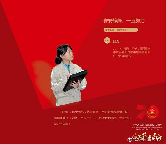 劉方,電力專業(yè)女博士,國網(wǎng)重慶市區(qū)供電公司配電運(yùn)檢室主持工作的副主任和主持黨務(wù)工作的黨支部副書記——重慶市“五一勞動獎(jiǎng)?wù)隆鲍@得者,國家電網(wǎng)公司勞動模范、劉方勞模工作室領(lǐng)軍人物。從調(diào)控中心到運(yùn)維檢修部、發(fā)展策劃部,到再回配電運(yùn)檢室。12年間,劉方在三個(gè)不同業(yè)務(wù)領(lǐng)域奮斗過,她帶領(lǐng)團(tuán)隊(duì)在三個(gè)月內(nèi)完成了總計(jì)60多個(gè)變電站的整合調(diào)試,參與推動了來福士廣場的朝天門變電站聯(lián)建實(shí)現(xiàn)政府、企業(yè)、居民的三贏,在工作中她給同事留下始終“不慌不忙”、始終安安靜靜、一直努力沉淀的印象。因?yàn)閷I(yè),所以專注;因?yàn)閷W?,所以安靜,芳華自開。