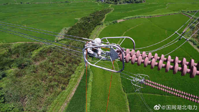 【線下綠意盎然,線上熱火朝天】7月19日,盛夏烈日當(dāng)頭,國網(wǎng)湖北檢修公司輸電檢修中心職工正熱火朝天地開展帶電作業(yè),處理導(dǎo)線引流板發(fā)熱問題,確保主網(wǎng)穩(wěn)定供電。