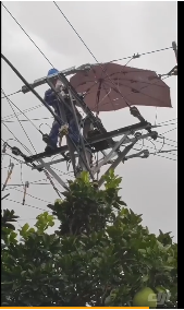8月12日,國網(wǎng)廣安供電公司華鎣供電分公司中和供電所員工們?cè)?0KV中臨線羊頭壩村5號(hào)臺(tái)區(qū)2號(hào)桿“電桿上撐傘改負(fù)荷”,確保客戶穩(wěn)定可靠用電無憂。