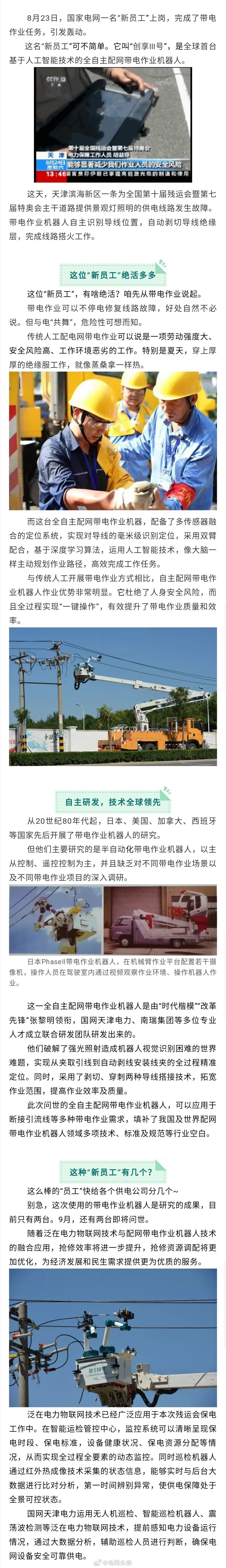 國家電網(wǎng)特殊“新員工”上崗】8月23日,國家電網(wǎng)一名“新員工”上崗,完成了帶電作業(yè)任務(wù),引發(fā)轟動。這名“新員工”可不簡單。它叫“創(chuàng)享Ⅲ號”,是全球首臺基于人工智能技術(shù)的全自主配網(wǎng)帶電作業(yè)機(jī)器人。這位“新員工”絕活多多,一起來看