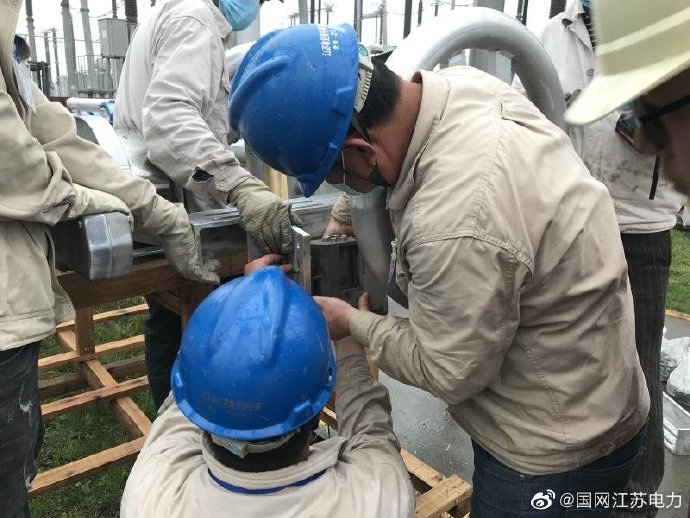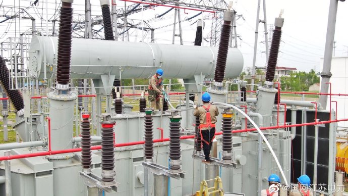 【電網(wǎng)增容擴(kuò)建助力地方經(jīng)濟(jì)發(fā)展】4月17日,在江蘇南通三官殿500千伏變電站主變?cè)鋈莨こ态F(xiàn)場(chǎng),江蘇省送變電有限公司施工人員正在安裝主變?cè)O(shè)備。本次擴(kuò)建將原有2臺(tái)750兆伏安主變?cè)鋈轂?000兆伏安,預(yù)計(jì)6月份投入運(yùn)行。運(yùn)行后將有效緩解現(xiàn)有主變供電壓力,滿足南通東南片區(qū)經(jīng)濟(jì)發(fā)展,大幅提升500千伏電網(wǎng)供電可靠性。