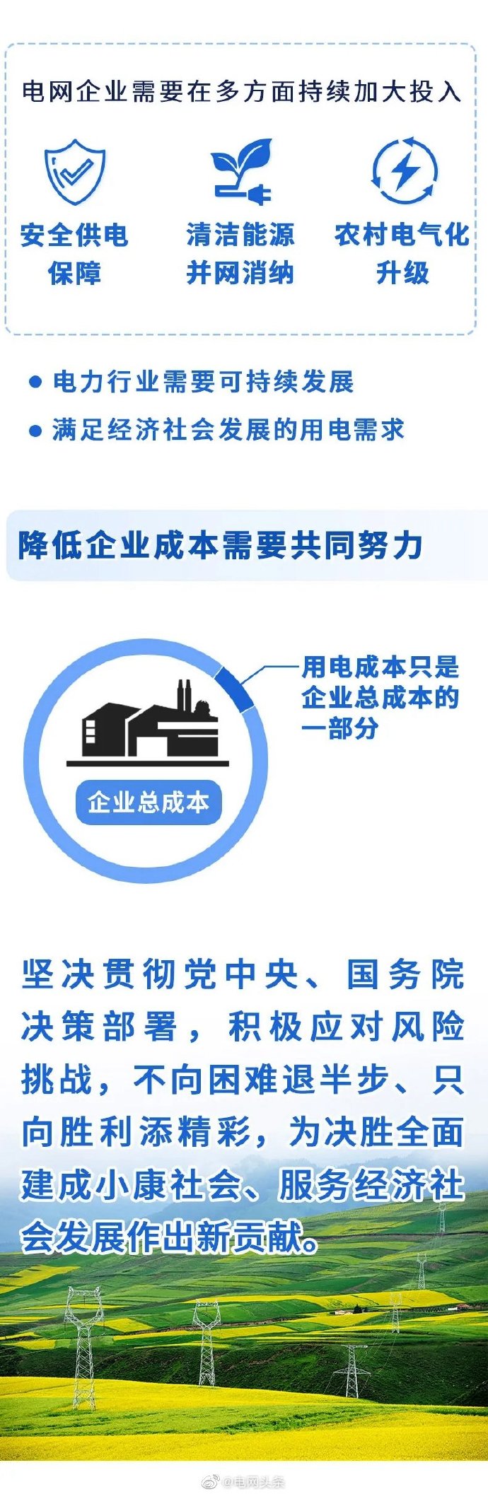 2020年是全面建成小康社會和“十三五”規(guī)劃收官之年,公司將堅(jiān)決貫徹中央經(jīng)濟(jì)工作會議精神,深入踐行新發(fā)展理念,不折不扣落實(shí)好黨中央、國務(wù)院各項(xiàng)決策部署,認(rèn)真履行央企政治責(zé)任、經(jīng)濟(jì)責(zé)任、社會責(zé)任,全力推動(dòng)電網(wǎng)高質(zhì)量發(fā)展。