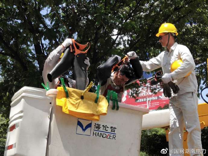 7月26日,室外氣溫高達40度,婁底公司“電駿馬”共產(chǎn)黨員服務隊在對城北I線23號桿進行帶電更換隔離開關,服務隊隊員在工作斗內(nèi)作業(yè),全身濕透,衣服如水洗過一般,脫下的衣服、手套都可以擠出水來。