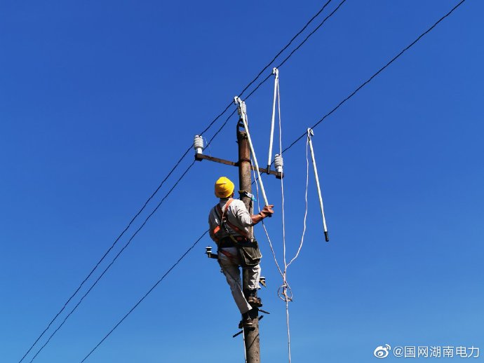 湛藍的天空,碧綠的稻田,在藍天和稻田之間,電桿上揮汗如雨的電力蜀黍便是最美的風景。7月13日上午,國網(wǎng)耒陽市供電公司哲橋供電所的配電運行員李康橋、譚小紅正在處理10千伏南集線#122桿C相導線故障。